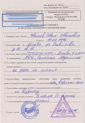 Этот документ, выданный в поликлинике по месту жительства, является подтверждением здоровья ребенка. Медсправка для детского лагеря также может содержать сведения о наличии у ребенка хронических заболеваний, об уровне его физической подготовки, сделанных прививках. Такая детальная информация позволяет сотрудникам оздоровительного центра разработать программу отдыха школьника с учетом особенностей его здоровья, при необходимости обеспечить квалифицированную медицинскую помощь.