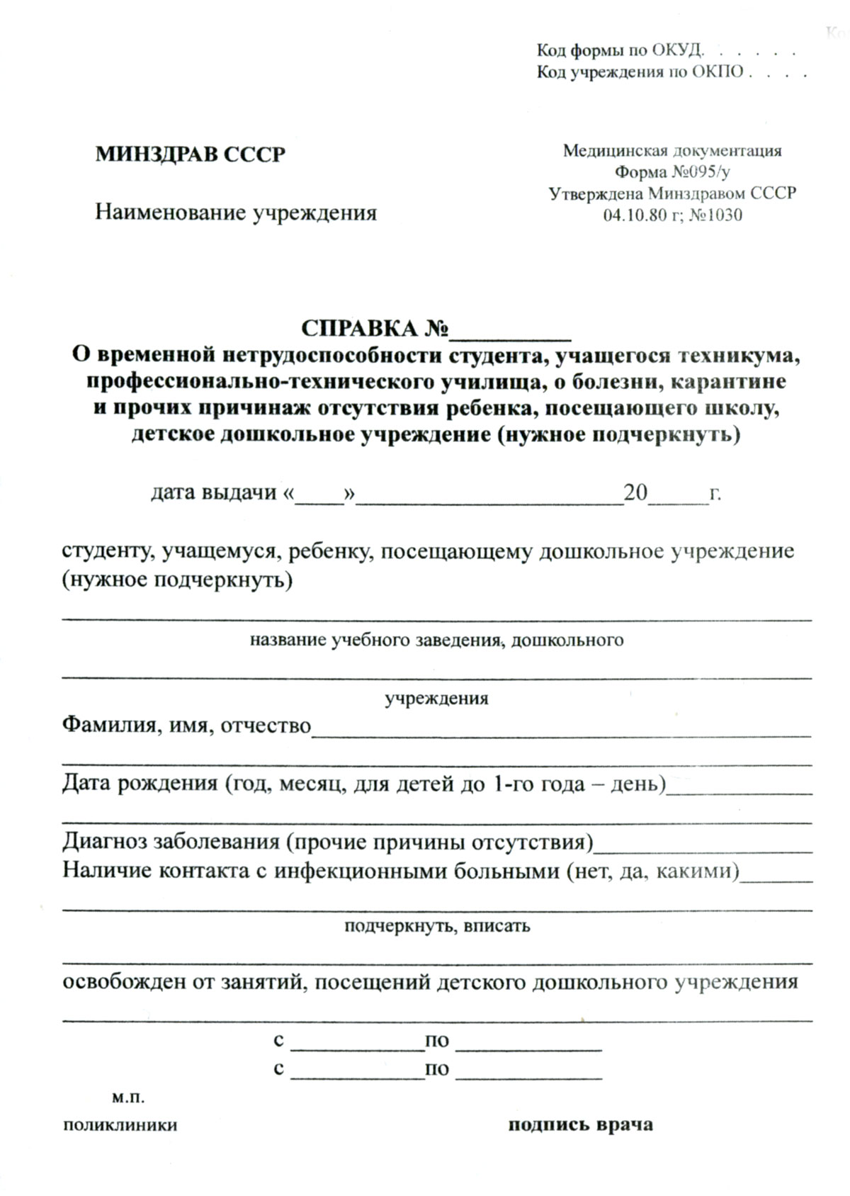 Форма 095 выдается лечебным учреждением школьнику, студенту, учащемуся, как подтверждение его временной нетрудоспособности из-за перенесенного заболевания. Срок действия медсправки 095 составляет 10 дней, при необходимости он продлевается до двух недель. Выданная лечащим доктором справка является не только оправданием отсутствия на уроках, но и освобождением от физических нагрузок.Справка о болезни для школьников